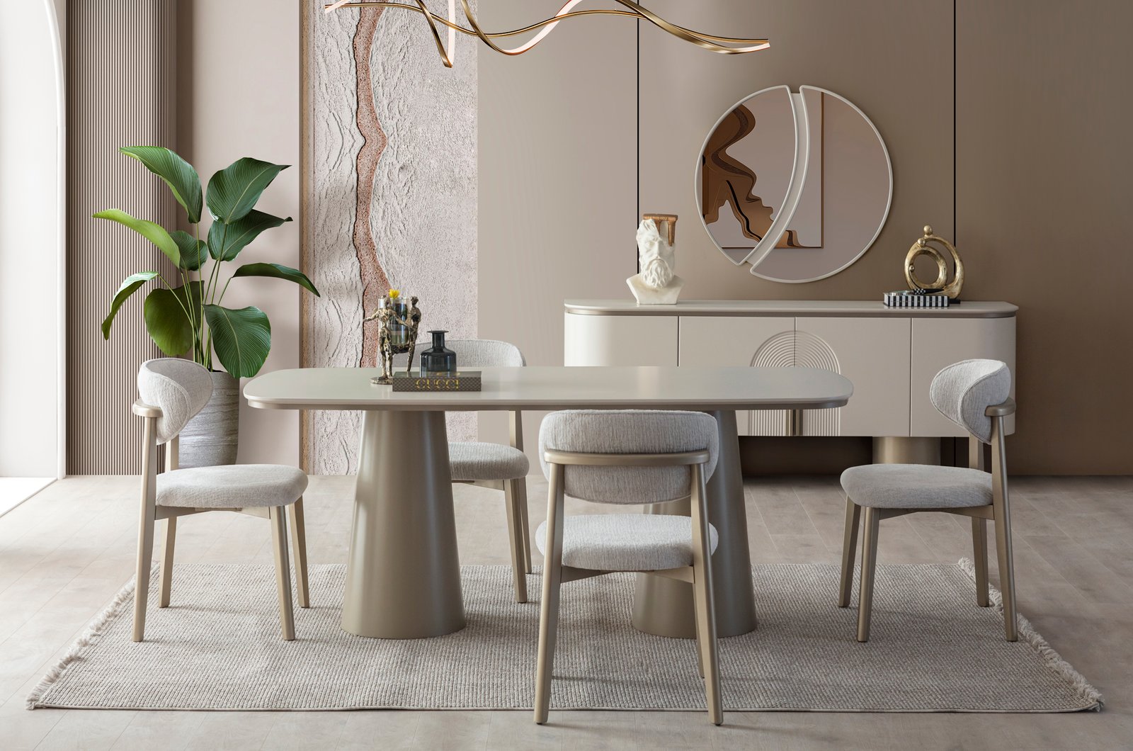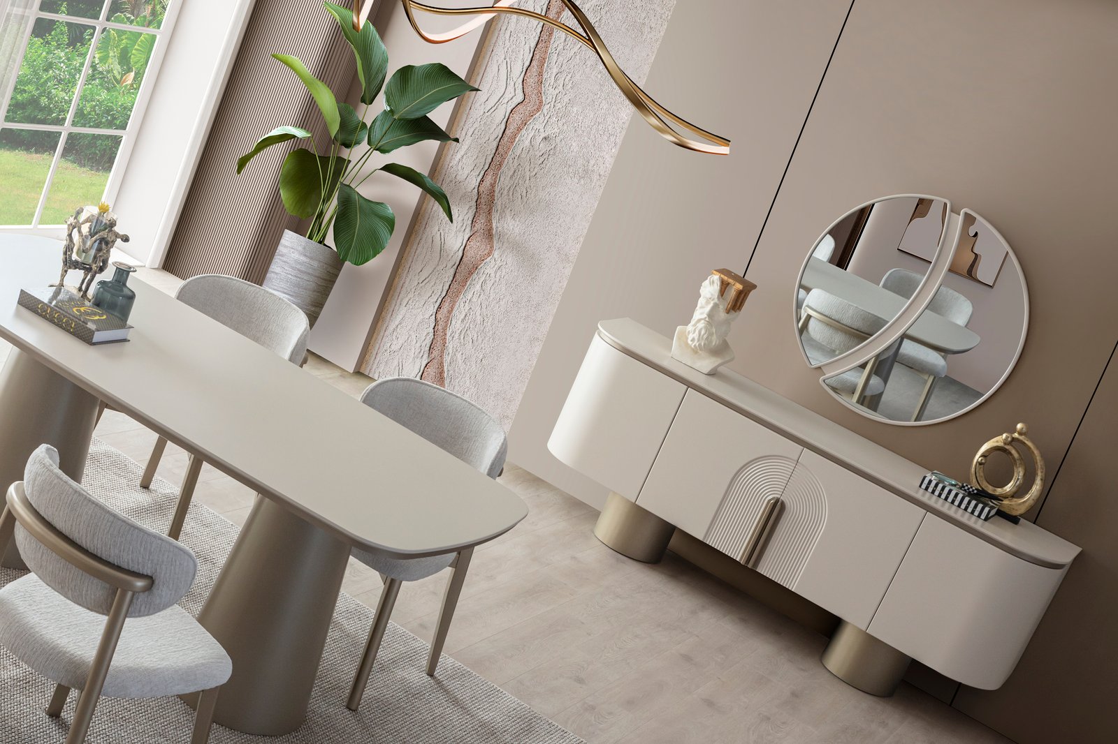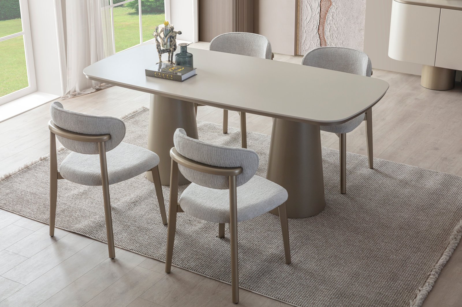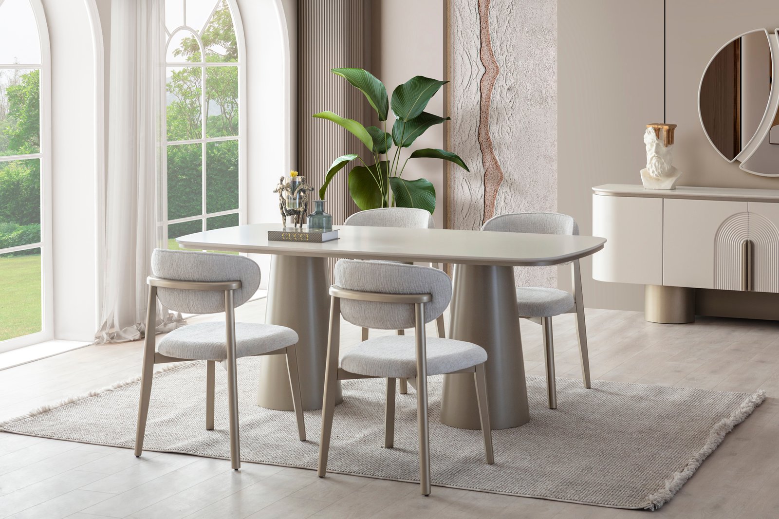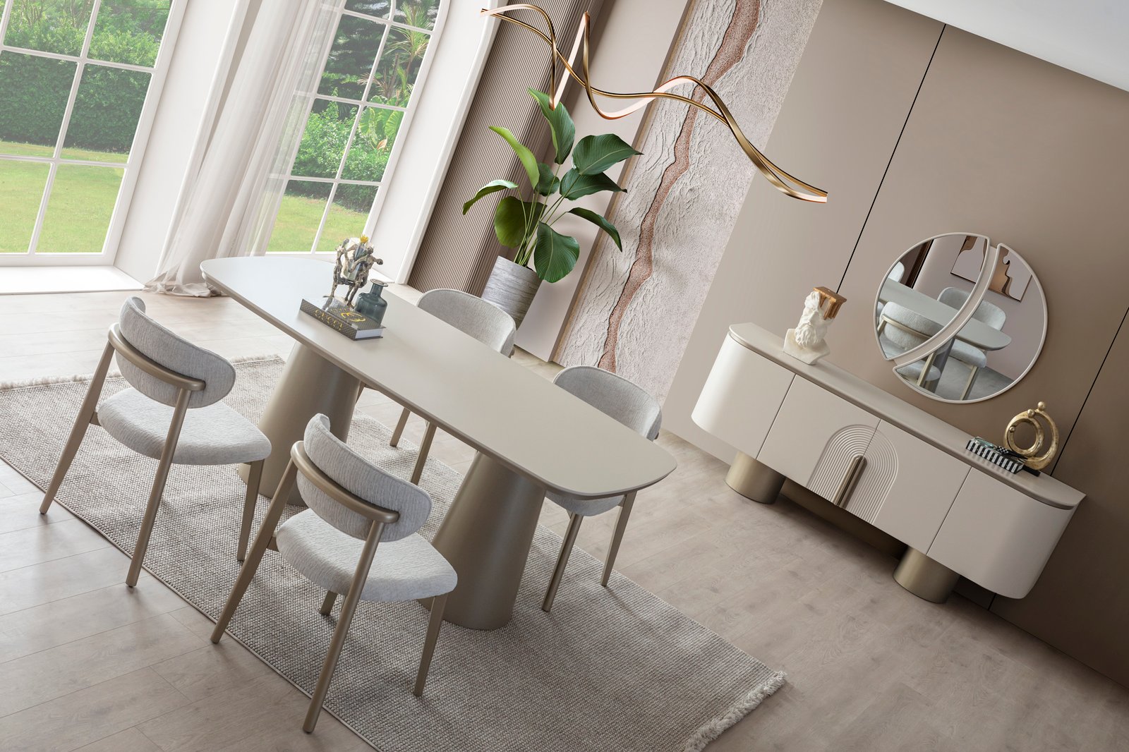 Ürün içeriği; 4 sandalye + yemek masası + konsol ve aynası şeklindedir.